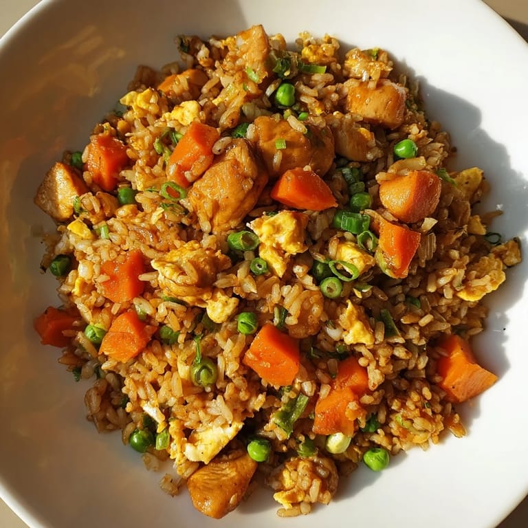 Pin It There's something deeply satisfying about the sound of chicken hitting hot oil in a wok—that sharp sizzle that tells you everything is about to come together beautifully. I stumbled into making chicken fried rice during a lazy Friday when my fridge had odds and ends that needed rescuing: some leftover rice from takeout three days prior, a few eggs, and chicken I'd meant to cook earlier in the week. What started as a mission to avoid waste turned into one of those meals I now make intentionally, craving that perfect balance of tender chicken, fluffy eggs, and just enough sauce to make every grain sing.