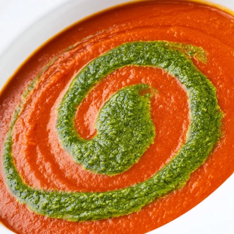 Pin It The smell of tomatoes simmering with garlic hit me the moment I opened the kitchen door, and I knew my neighbor was making something special. She invited me in, showed me her pot of ruby-red soup, then spooned a green swirl across the top that made the whole thing come alive. That was the day I learned a simple drizzle could turn comfort into something worth celebrating. I went home and made my own version that same evening, standing over the stove with the windows fogged and my sleeves rolled up. It tasted like warmth and a little bit of luck.
